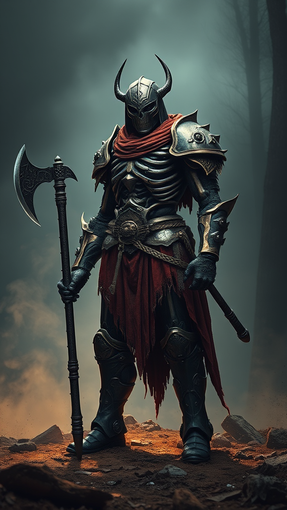 A towering Nordic warrior with dual axes stands in a desolate landscape, their presence formidable and ethereal. The character's armor is crafted in a dark bronze and crimson palette, showcasing a crumpled, deconstructive skeletal aesthetic. This eerily realistic figure seems as if emerging from dusty piles, embodying the essence of gothcore and dark fantasy reminiscent of Antonio J. Manzanedo's works. The full-length body shot reveals finely detailed armor, intricate weapon designs, and elaborate patterns, captured in ultra-detailed, hyper-realistic quality. The scene is lit with dramatic, shadowed lighting evocative of a 4D dimension, enhancing the ultra-realism and depth of the warrior's presence.