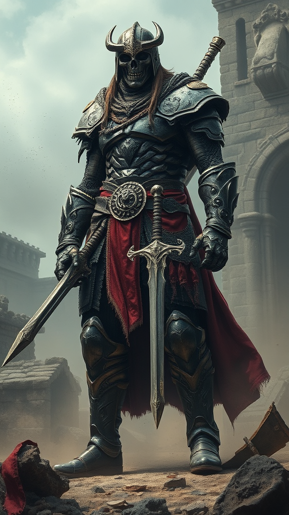 A towering Norse warrior clad in dark bronze and crimson, looming with an air of authority, clutching swords that glint with menace. His form is crumpled and deconstructive, skeletal yet commanding, standing amidst dusty ruins that whisper of ancient battles. In the spirit of gothcore and Dark Fantasy, as envisioned by Antonio J. Manzanedo, the full-length depiction reveals armor embellished with intricate and hyper-detailed designs. This hyper-realistic scene captures the warrior with ultra-detailed precision, highlighting every ornate feature of his finely crafted armor and weapons. The lighting adds a photographic realism, enhancing the multi-dimensional depth of the setting and character.