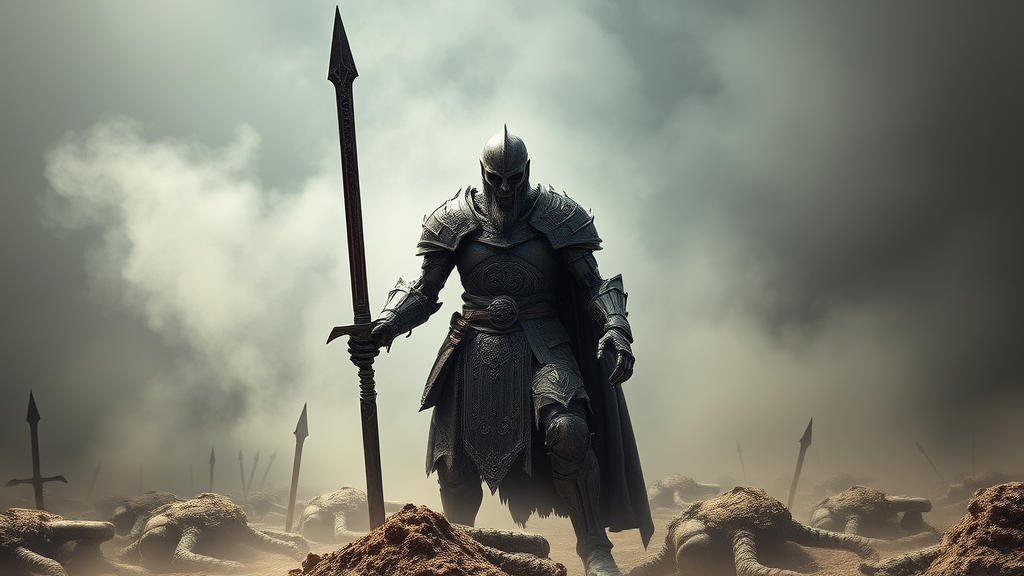 A towering Norse warrior clad in intricately detailed armor stands amidst a mist-laden battlefield. His twin swords are forged from dark bronze, casting a blood-red sheen, their blades etched with ancient runes. The figure appears almost skeletal, as if emerging from legend, with a deconstructive design that blurs the line between myth and reality. The dust of ages clings to him, adding to the eerie realism of the scene. His armor, finely wrought with gothic motifs, resembles a relic from a Dark Fantasy realm envisioned by Antonio J. Manzanedo. Every joint and plate is hyper-detailed, an ultra-realistic depiction that captures both the intricacy and brutality of his war-worn presence. Beside him lie dusty piles of fallen foes, a testament to his prowess. The setting is illuminated with dramatic photography lighting, casting shadows that enhance the warrior's formidable and otherworldly aura, captured in the highest detail quality and dimensions imaginable as he seems to straddle the limits of a 4D dimension.