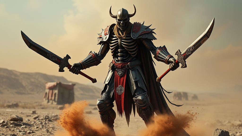 A towering Norse warrior stands amidst a desolate landscape, wielding twin blades with an aura of dark power. His form is cast in shades of deep bronze and crimson, appearing as if sculpted from the remnants of a great battle. The character's contorted, deconstructive physique reveals a skeletal structure beneath intricately detailed armor. Each piece is adorned with ornate engravings and weathered designs, blending gothic motifs with an eerie realism. Dust swirls around his feet like ancient whispers as he poses, evoking a sense of dark fantasy reminiscent of Antonio J. Manzanedo's style. The hyper-realistic scene captures every minute detail, from the creases in his armor to the intricate patterns on his weapons. The lighting is reminiscent of a dramatic photograph, accentuating the surreal atmosphere of this ultra-detailed warrior from another dimension.