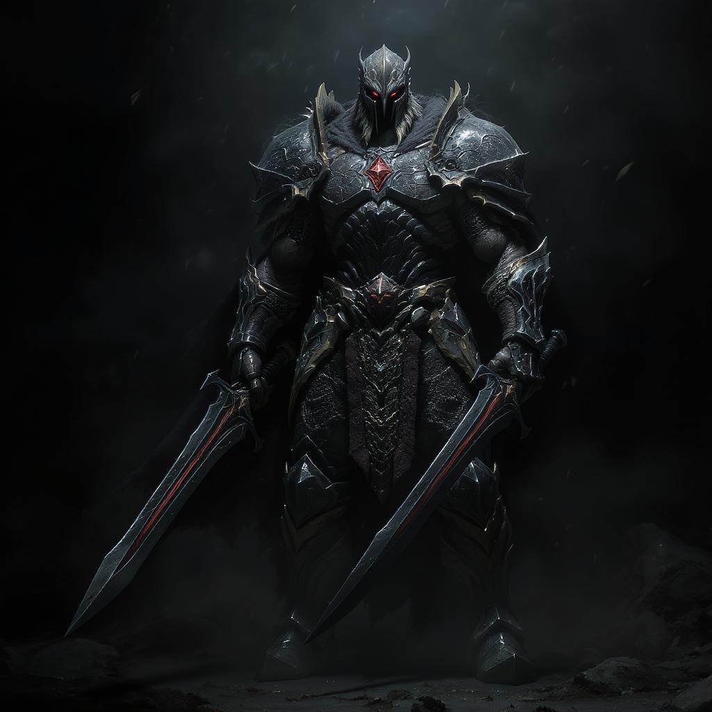 A towering Norse warrior stands imposing, cloaked in shadows, wielding dual swords with dark bronze hilts gleaming red under dim, moody lights. His armor is a masterpiece of gothic and dark fantasy, echoing the eerie realism of skeletal remains with finely crumpled, deconstructive patterns. Dust collects in forgotten crevices, adding an age-old mystique. Inspired by the styles of Antonio J. Manzanedo, his full-length figure is captured in a hyper-realistic photographic style, showcasing intricately detailed armor that appears almost ancient yet advanced, as if crafted from another realm. The warrior's presence is both intimidating and awe-inspiring, with the design reaching from the mortal realm into the 4th dimension, embodying the highest quality detail achievable in otherworldly fashion. His weapons, ornate yet functional, reflect an ultra-realistic craftsmanship, set against a backdrop that resonates with the ethereal and gothic elements of gothcore fantasy.