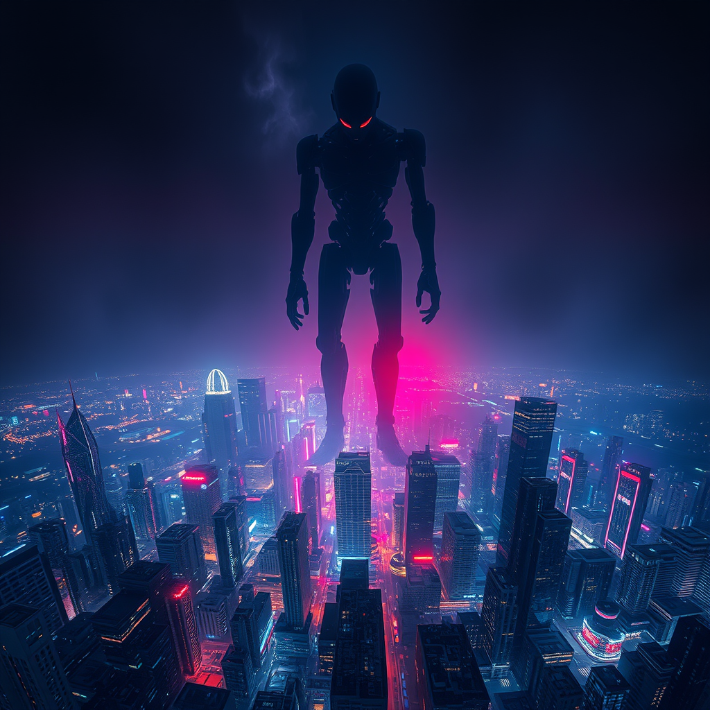 A towering, ominous cybernetic figure looms over a sprawling, neon-lit metropolis, exuding a palpable air of malevolence. The scene captures the essence of a dystopian future, with dark, gritty undertones and electrifying hues dancing in the night. Photographed using a mirrorless camera with an ultra-wide lens, the composition draws the viewer in with its 2.35:1 aspect ratio, achieved in manual mode at a shutter speed of 1/60, aperture set to f/2.8, and an ISO of 3200. In post-processing, the image comes alive with moody color grading and artful light leaks that subtly guide the eye, while a delicate vignette adds depth and a sinister touch.