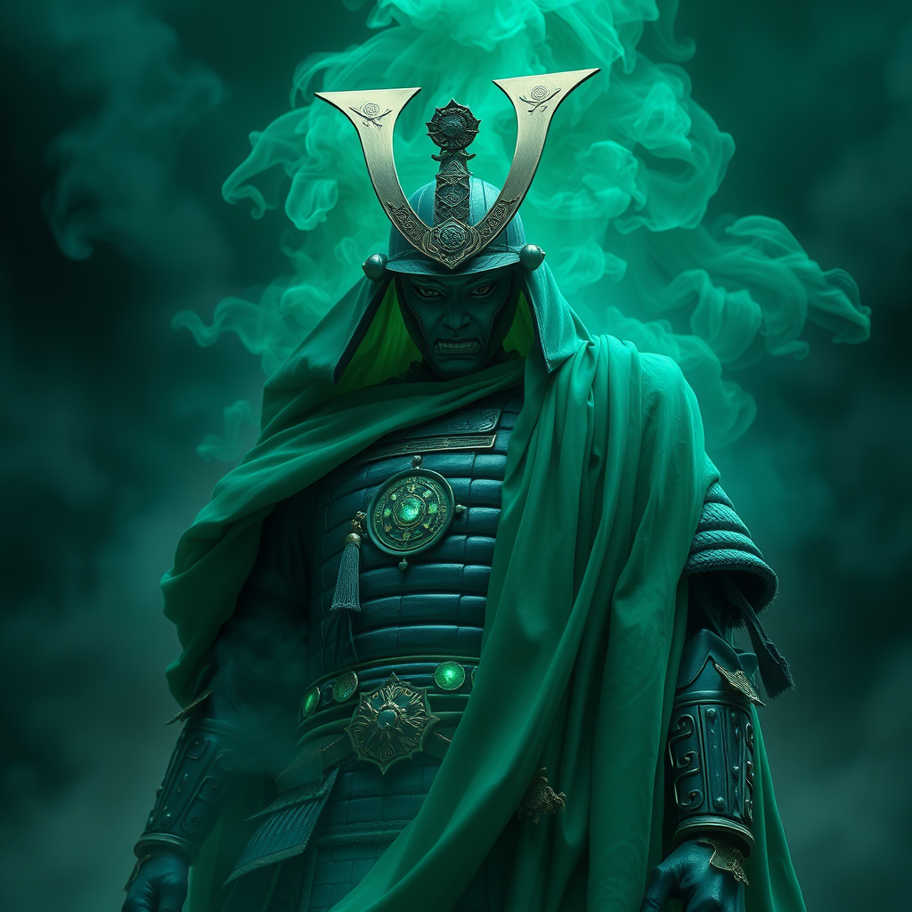 A towering samurai deity cloaked as an emerald-hued being, rendered in a hyper-realistic style reminiscent of Vincent van Gogh and F.W. Murano, adorned in GALAXY-inspired full body armor. Jet black smoke spirals ominously around it, creating dark atmospheric effects. Captured in highly detailed, epic ultra-wide scenes with a 135mm lens emphasis, the setting evokes a sense of otherworldly grandeur, while subtle cosmic motifs glimmer across its armor. The overall tone is both mystical and formidable, blending the essence of historic warrior spirit with celestial wonder.