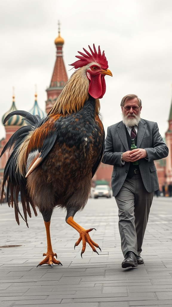 A towering, scraggly rooster, twice the height of a person, strides confidently on two legs, clad in a shabby, worn-out suit. Beside this colossal bird, a 45-year-old man in a rumpled, neglected executive-style suit stands, sporting an unkempt beard and clutching a rum bottle, emanating the aura of a troubled individual. Both the rooster and the man exude an air of determination as they advance toward the camera on Red Square, with the iconic silhouette of St. Basil's Cathedral forming a striking backdrop. The extraordinary size of the rooster is highlighted, making it appear significantly larger than the man.