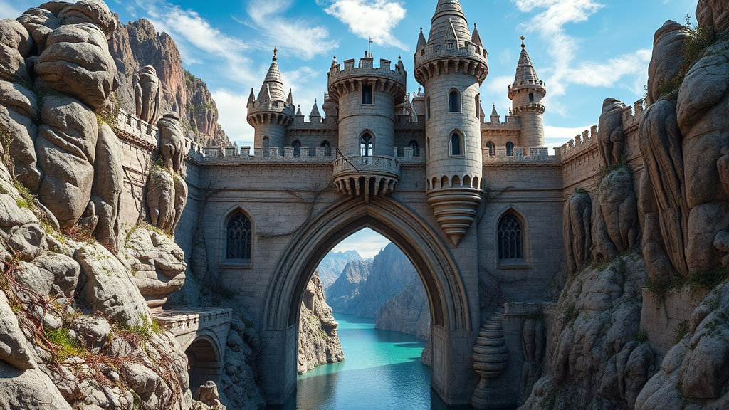 A towering sculpted castle with intricately carved stone walls sits majestically in the rugged terrain of the rocky mountains, embodying the essence of gothic futurism. Inspired by the visionary styles of Eve Ventrue and Filip Hodas, the structure exudes an air of structured chaos, combining elements of history with a futuristic twist. A dramatic passage arches gracefully over a shimmering body of water that mirrors the vibrant blue skies above. The entire scene is imbued with elaborate detail, from the ornate buttresses to the whimsical spires that pierce the sky, creating an otherworldly silhouette. Gnarled vines and wisps of mist weave through the stone, adding a touch of nature’s unpredictability to this architectural marvel.