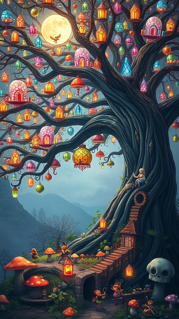 A towering tree with branches made of vibrant glass, casting prismatic shadows on a whimsical village below, where tiny humanoid insects play instruments made of leaves and twigs, their homes nestled in colorful mushrooms, all under a glowing moon with a playful smile, in the style of Studio Ghibli, dreamlike atmosphere, gentle luminescence, intricate detail, enchanting storybook charm.