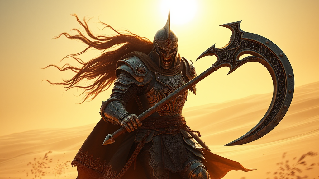 A towering vampire knight roams the sunlit deserts of Egypt, the essence of war and fantasy intertwined in his very aura. Clad in intricately carved full-plate armor, his helmet lacks a visor, allowing long, flowing hair to cascade in the desert breeze. With a war scythe gripped firmly in his hands, he strikes with an unstoppable force, his fangs glinting ominously in the sunlight. The scene is filled with elements of epic and dark fantasy, capturing a moment of intense action with hyper-realistic detail. His presence is both majestic and terrifying, amidst the cinematic lighting that illuminates his path, striking a vivid contrast against the radiant sands.