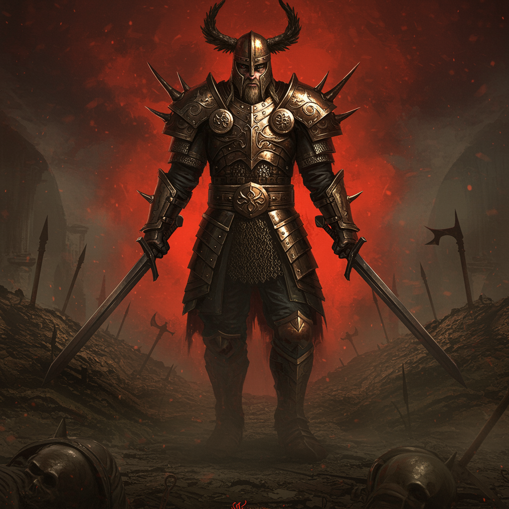 A towering Viking figure clad in elaborately detailed armor, wielding fearsome swords, emerges in a realm of dark bronze and crimson hues. The scene is deconstructive and skeletal, exuding an eerie realism amidst dusty piles. Influenced by gothcore and Dark Fantasy, the work reflects the style of Antonio J. Manzanedo. The figure's armor and weaponry boast intricate designs and embellishments, achieving hyper-realistic and ultra-detailed quality. The lighting resembles cinematic photography, enhancing the 4D dimensionality of the scene. Despite small creative modifications, the central motif remains vibrant and intensely detailed, suggesting a mythical warrior brought to life in a hyper-realistic fantasy tableau.