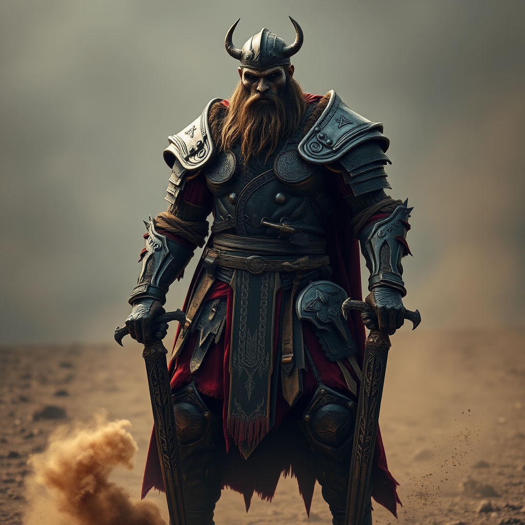 A towering Viking warrior, clad in dark bronze and blood-red armor, stands amidst a desolate landscape. His form is skeletal yet powerful, with intricately deconstructed armor that speaks of countless battles. Dusty remnants swirl around his feet as if he emerged from ancient, forgotten tales. The armor, hyper-detailed, bears intricate runes shimmering subtly against photography-grade lighting, while his dual swords, etched with mysterious patterns, glint menacingly in the sparse light. The setting evokes an eerie realism, capturing the essence of dark fantasy with a gothcore aesthetic. Despite the crumpled and deconstructed appearance, there's an air of regal menace surrounding him. This ultra-realistic depiction, inspired by the evocative style of Antonio J. Manzanedo, mesmerizes with its ultra-detailed portrayal, as though stepping from a 4D dimension into this moment.