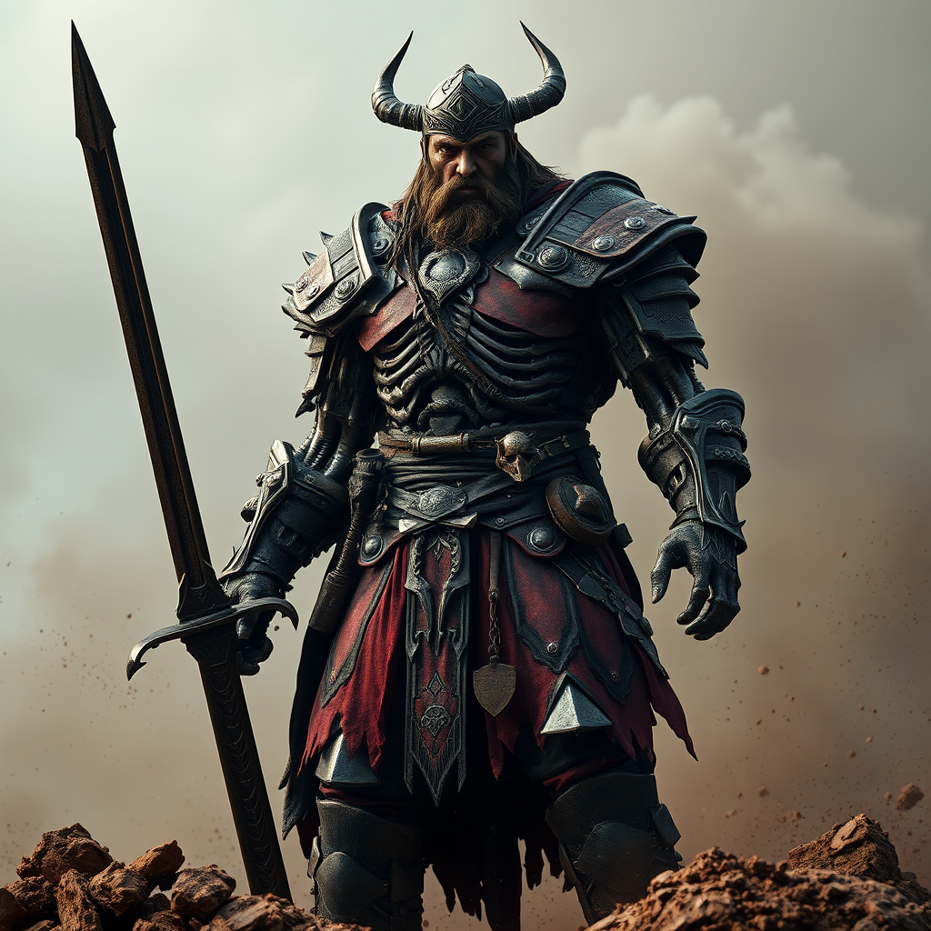 A towering viking warrior, clad in intricately detailed armor that melds dark bronze and burnished red tones, stands menacingly with twin swords. His form appears crumpled and deconstructive, hinting at a skeletal frame beneath. The atmosphere around him is eerily realistic, akin to dusty piles that evoke an ancient battlefield. This scene embodies gothcore elements within a dark fantasy realm. Created in the captivating style of Antonio J. Manzanedo, every aspect—from his armor's intricate designs to the hyper-realistic portrayal of his facial features—is meticulously crafted with ultra-detailed precision. The photography-inspired lighting enhances the surreal nature of this 4D dimensional depiction, offering the highest detail quality and an ultra-realistic presence.