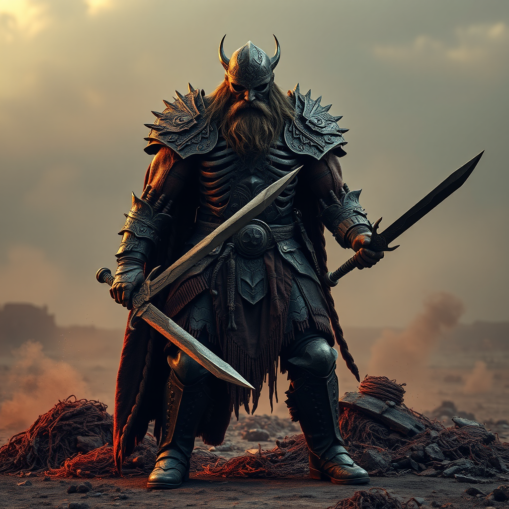 A towering Viking warrior stands amidst a desolate landscape, wielding dual swords with a menacing presence. His armor, crafted with intricate designs, features a fusion of dark bronze and blood-red hues, giving an impression of crumpled and deconstructive artistry. The skeletal structure of his armor reveals a haunting realism, accentuating an otherworldly aura. Dusty piles surround him, adding to the gothcore aesthetic of the scene. Inspired by Dark Fantasy and the work of Antonio J. Manzanedo, the full-length body shot captures the finest details of the ultra-realistic and hyper-detailed attire, with textures so intricate they evoke a 4D dimension experience. The photography lighting enhances every facet of his terrifyingly real visage, immersing the viewer in a realm of gothic myth and legend.