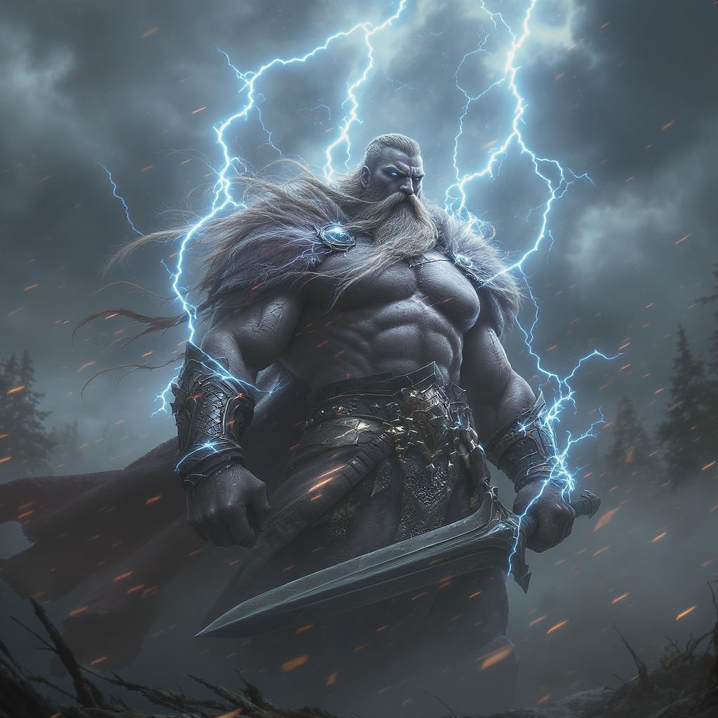 A towering viking warrior stands poised in battle, his braided beard flowing in the wind, armor glinting under ethereal fairy lights. Volumetric rays cut through the mist, casting an enchanting glow around him, highlighting intricate tattoos on his muscular arms. The scene feels alive with dynamic energy, set against a backdrop of ancient forests and stormy skies, captured in ultra detailed, photorealistic HDR.
