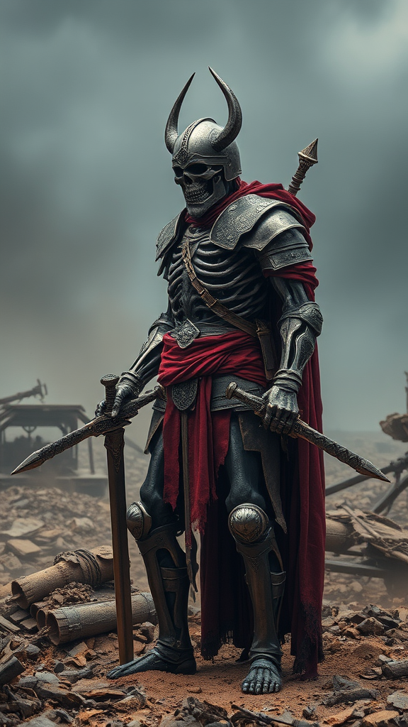 A towering viking warrior with dual swords, embodying a fusion of dark bronze and deep crimson hues, exudes an aura of crumpled and deconstructive elegance. The skeletal figure stands amidst dusty piles, capturing an eerily realistic presence that resonates with gothcore and Dark Fantasy influences reminiscent of Antonio J. Manzanedo's work. This full-length depiction reveals finely detailed armor adorned with intricate designs, showcasing hyper-detailed craftsmanship and ultra-realistic features. The ambient photography lighting accentuates the ultra-detailed textures, creating a 4D dimension effect in the highest detail quality, bringing the character to life with a unique and haunting allure.