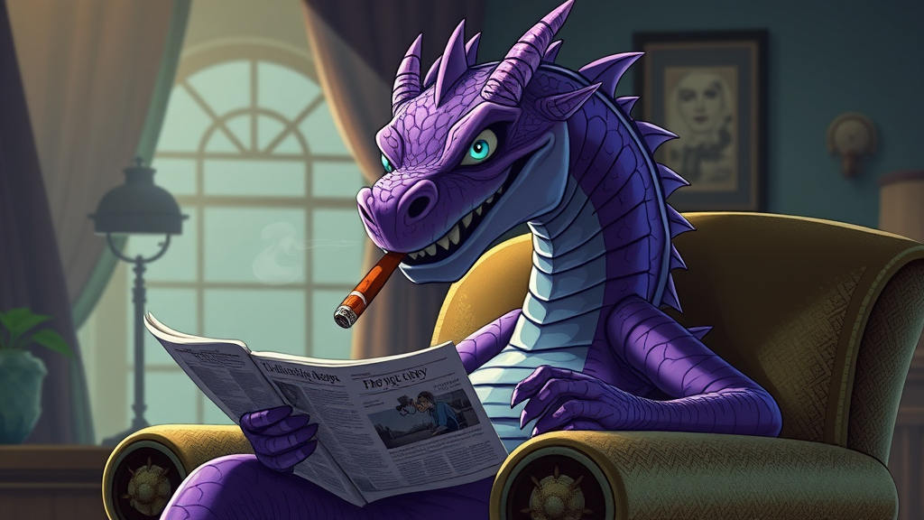 A towering violet dragon with a mischievous grin, adorned with gleaming azure eyes and jagged spikes running down its spine, casually puffs on a vintage cigarillo while lounging in an oversized armchair, engrossed in a futuristic newspaper, all depicted in a nostalgic cartoon style with dramatic cinematic lighting.
