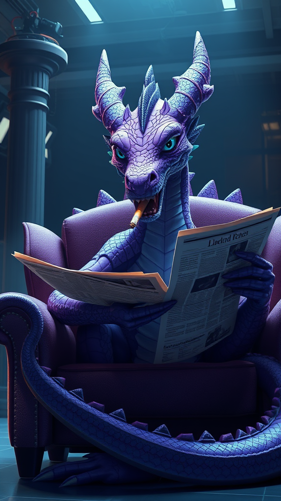 A towering violet dragon with gentle, azure eyes glistening with a touch of mischief sits comfortably in an oversized armchair, tendrils of smoke curling from the cigarette delicately balanced in its mouth. Its back is lined with shimmering, iridescent spikes that catch the light in a captivating display. The dragon's massive claws carefully grip an old-fashioned newspaper, the crisp pages rustling faintly in the still air. Set against a futuristic backdrop, the scene is illuminated with cinematic lighting, casting long, dramatic shadows and creating a retro cartoon ambiance that feels both nostalgic and avant-garde.