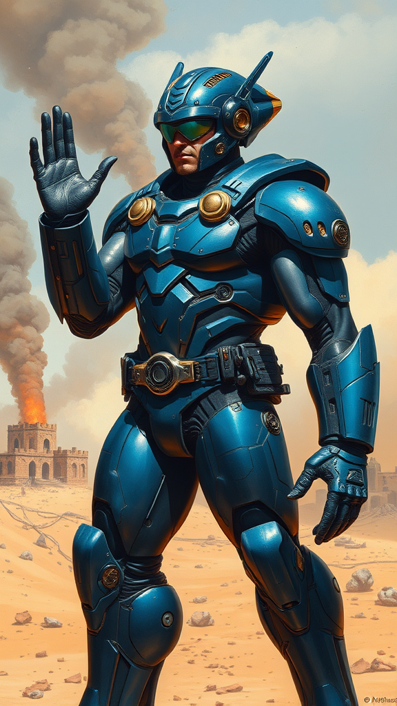 A towering warrior clad in gleaming blue power armor stands resolute on the sun-baked earth, his muscular physique accentuated by the form-fitting suit. His eyes, shielded by sleek, cutting-edge goggles, scan the horizon with intensity. Behind him, an abandoned desert village smolders, tendrils of smoke curling into the cloudless sky. The futuristic headpiece he wears is intricate, resembling an advanced robot with intricate designs and glowing elements. He is a beacon of strength and resilience, waving a hand as if commanding the scene, his figure blending the fantasy allure of Boris Vallejo and Frank Frazetta with the dynamic realism of Alex Ross. The atmosphere is one of raw, unyielding power and mystique, captured in a composition that evokes a legendary hero standing amidst the ruins of a forgotten world.