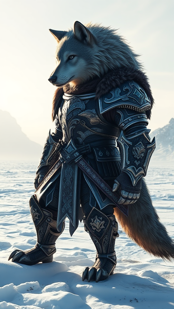 A towering wolf warrior stands on a vast snowy field, exuding a fierce and majestic presence. This anthropomorphic character, clad in intricate battle armor, combines the grace of a predator with the discipline of a seasoned fighter. Set in a fantasy realm, reminiscent of a D&D saga, the image captures a masterwork of realistic artistry. Every detail, from the lifelike texture of fur to the glimmer of armor under the pristine white snow, is rendered with hyper-detailed precision. Cinematic lighting casts dramatic shadows, enhancing the wolf's piercing gaze and the tension in its powerful stance. This scene, captured in 32k ultra-high definition, invites viewers to immerse themselves in a breathtaking and enigmatic world where mythology meets reality.