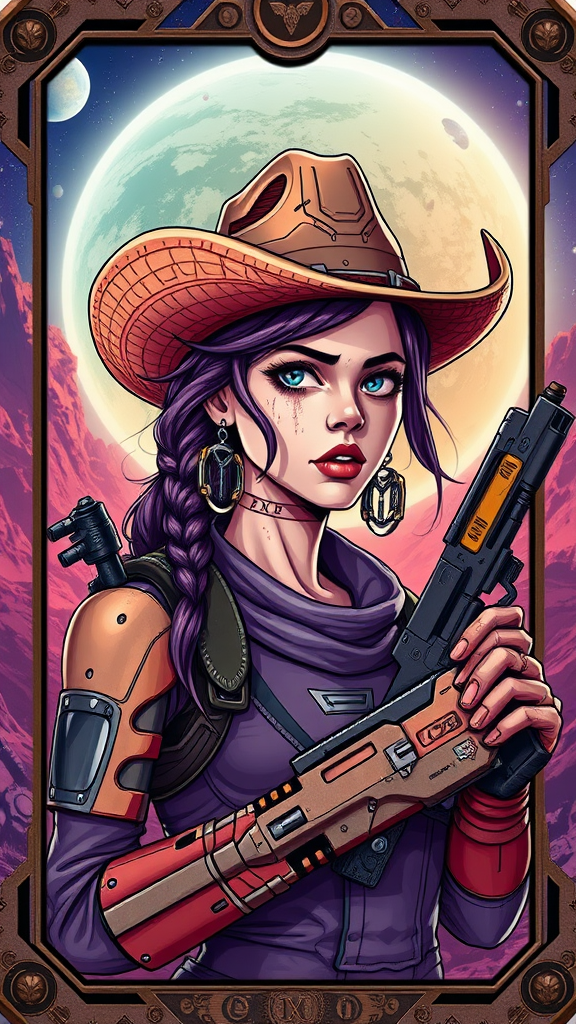 A trading card frame featuring a female space cowboy with a striking presence, adorned with a cowboy hat and exhibiting highly detailed skin. The design showcases stunning gradient colors set against an alien planet and galaxy backdrop, inspired by the Borderlands style. The image is insanely detailed with emphasis on absurd resolution, HDR quality, and cel shading. The atmosphere is accentuated by volumetric wires, with a focus on earrings and a rugged, dirty face. The composition is tightly cropped to emphasize the character, avoiding low resolution or any distracting elements like text, artifacts, signatures, or watermarks. The character is depicted with a confident pose, equipped with futuristic guns, standing out dramatically in the cosmic setting.
