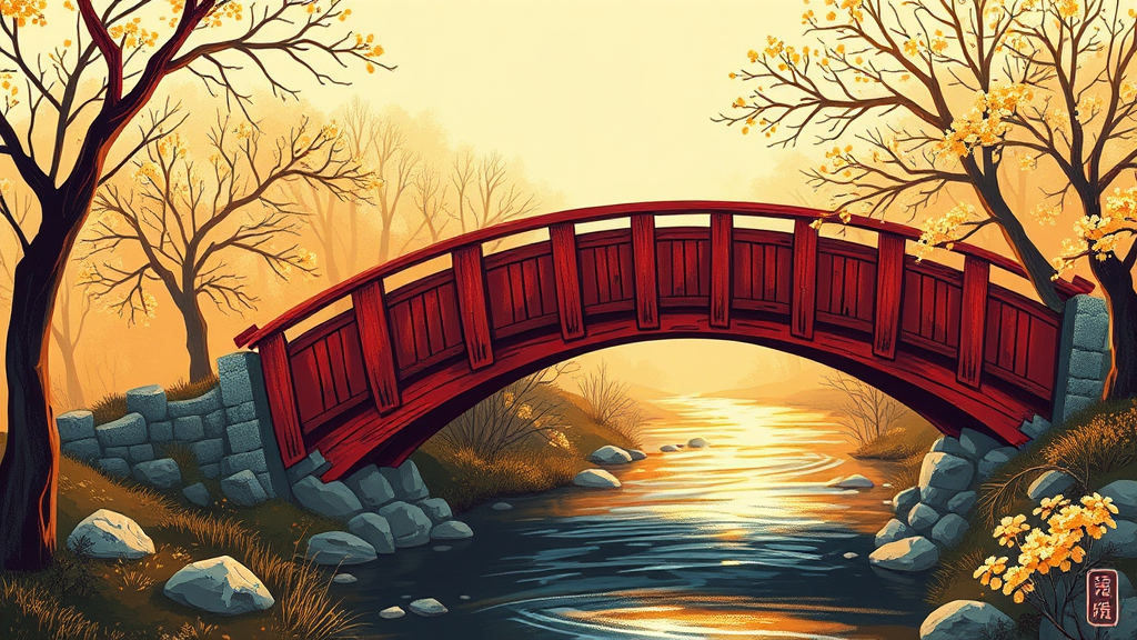 A traditional Japanese art style illustration depicting a weathered red wooden bridge arching gracefully over a meandering stream, bathed in the soft, ethereal glow of golden hour sunlight. The warm light filters through an abstract array of stylized, delicate trees that sway gently in the breeze. The scene weaves together elements of nostalgia and contemporary vibrancy, enhanced by the subtle interplay of light and shadow on the bridge's worn textures and the shimmering water below. The color palette includes rich earth tones and luminous golds, capturing a tranquil yet dynamic moment in a serene natural setting.
