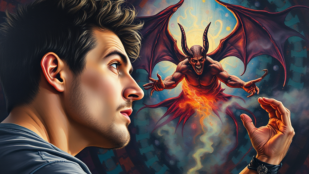 A traditional oil painting depicts a man gazing intensely as he transcends the fabric of reality, confronting an ethereal vision of the Devil amidst swirling DMT patterns. Painted in the rich, dynamic brushstrokes reminiscent of Diego Velasquez, the scene is a vibrant tapestry of mystical and surreal elements, portraying a blend of fear and enlightenment. The devilish figure is interwoven with vivid, abstract forms, capturing the essence of a psychedelic hallucination. The wide canvas enhances the depth and otherworldly allure of the experience.