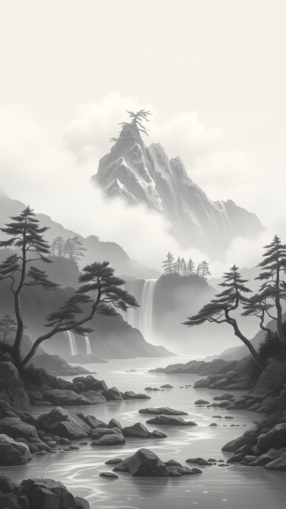 A tranquil landscape emerges in the style of a delicate suibokuga painting, featuring a towering mountain range enveloped in misty clouds. Soft, cascading waterfalls trickle down the mountainsides, surrounded by clusters of ancient pine trees swaying gently. In the foreground, a serene river weaves through a rocky terrain, reflecting the muted light of a pastel sky. The scene conveys a sense of harmony and balance, highlighting the subtle beauty of nature’s elements in a monochromatic palette enhanced with soft gradients.