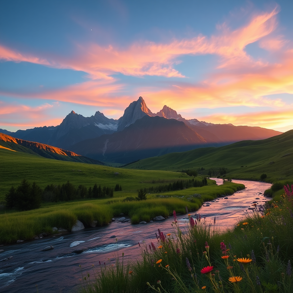 A tranquil landscape unfolds at dusk, with a serene river flowing gently through lush, verdant hills. Soft golden sunlight bathes the scene, casting long shadows and illuminating wildflowers that sway in a gentle breeze, their colors vibrant and alive. Majestic mountains tower in the background, their peaks kissed by the last light of the sun. The sky above transitions from deep blue to a tapestry of pink and orange hues, as a few stars begin to twinkle softly in the approaching night.
