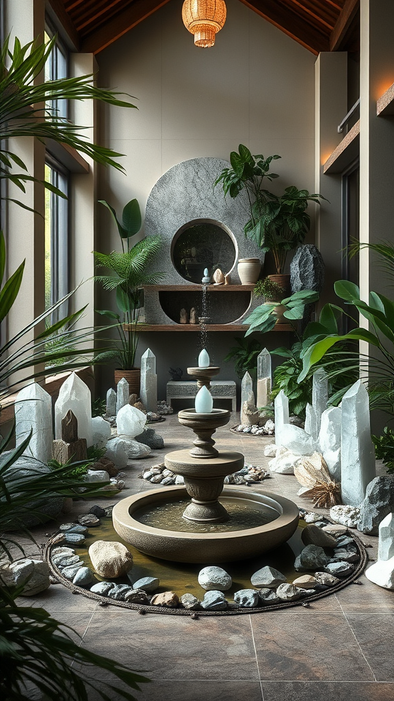 A tranquil sanctuary for meditation featuring an abundance of crystals and lush indoor plants, designed with serene architectural elements. The atmosphere exudes peace and balance, embracing hyperrealistic detail with soft, cinematic lighting that highlights the textures and natural beauty in 8k ultra hd quality. Subtle modifications include the gentle sound of a trickling water fountain and the calming aroma of sandalwood, enhancing the overall sensory experience.
