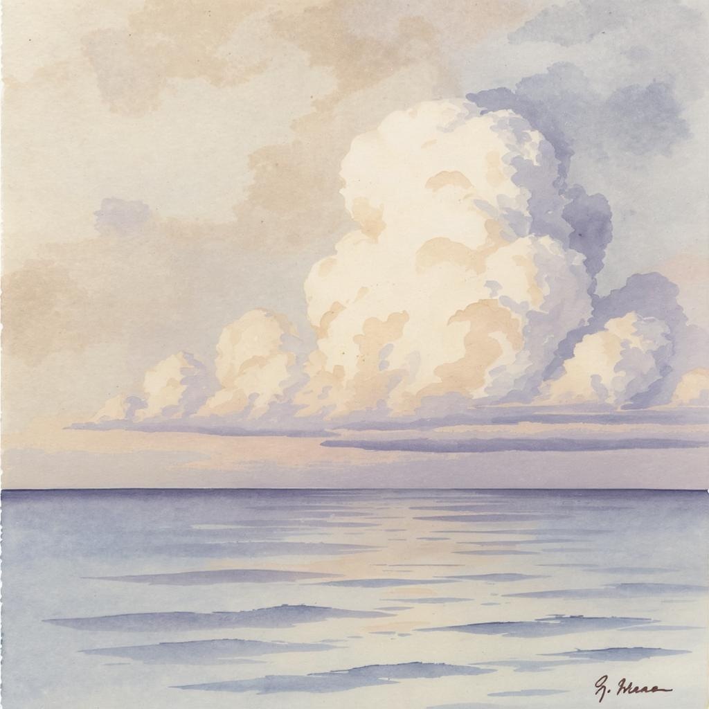 A tranquil watercolor painting portrays the peaceful beauty of an expansive sky merging with the calm sea at the horizon, awash with hues of tan, taupe, brown, white, and soft lavender, evoking a misty landscape. The clouds are illustrated with varying levels of detail, some sharply defined while others gradually dissolve into the distance, enhancing the sense of depth, like a two-dimensional sculpture.