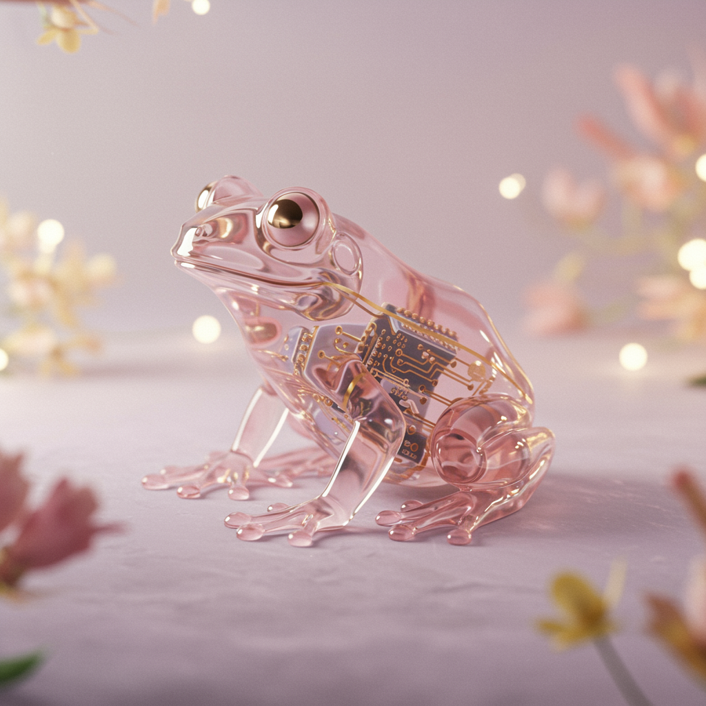A translucent glass frog with a gentle pink hue, showcasing an intricate circuit board within its body. The frog is crafted from sleek plastic, adorned with subtle gold details along its limbs and spine. The scene is rendered in a dreamlike style, featuring pastel and ethereal tones reminiscent of Hsiao Ron Cheng, set against a misty background of soft flora and delicate lighting.
