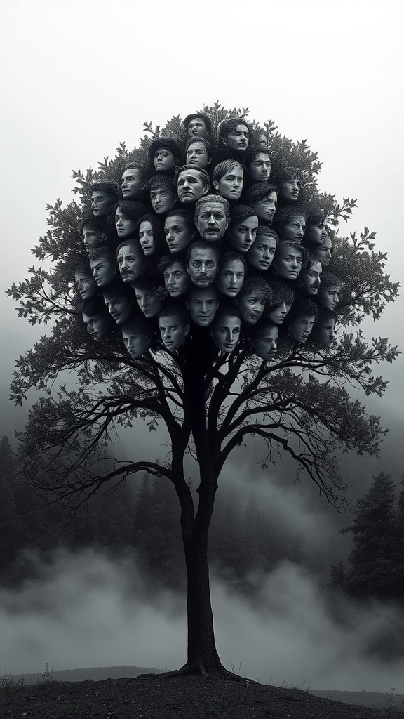 A tree composed of numerous human faces merges seamlessly with a misty mountain backdrop, enveloped in a fog-laden landscape. The scene evokes dark surrealism, captured in stark black and white. With cinematic hyper-realism, the image conveys an ethereal and haunting quality, blending nature with human elements in a dreamlike, otherworldly atmosphere.