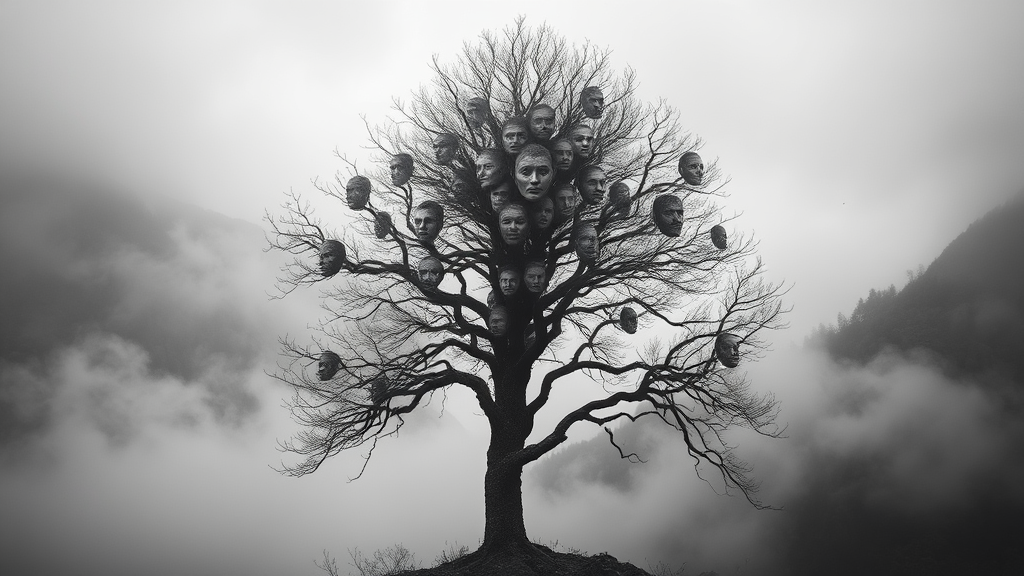 A tree formed from a multitude of human faces rises mysteriously against a backdrop of fog-shrouded mountains, the ethereal landscape enveloped in thick mist, invoking a sense of dark surrealism. Captured in moody black and white photography, the scene exudes an eerie cinematic realism, with intricate details highlighting the haunting beauty of faces woven into branches, giving the impression of an ancient, sentient being watching over the timeless, mystical terrain.