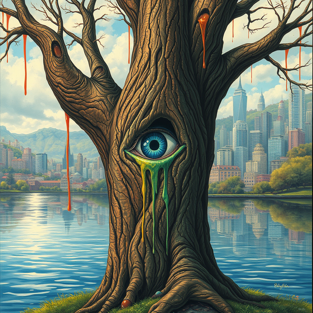 A tree standing near the edge of a shimmering lake, its bark textured with intricate patterns, houses a single, watchful eye nestled among the branches. Dripping paint cascades from the eye, creating vibrant trails that merge with the reflection of an expansive landscape that blends both natural and surrealistic urban elements. In the background, a cityscape inspired by the works of Brian Despain unfolds, merging the fantastical with earthly structures, as vivid colors reminiscent of Mars Ravelo's illustrations weave through the scene. A dreamlike aura encapsulates the composition, evoking the mystical precision and imaginative depth akin to Mati Klarwein's artistry.