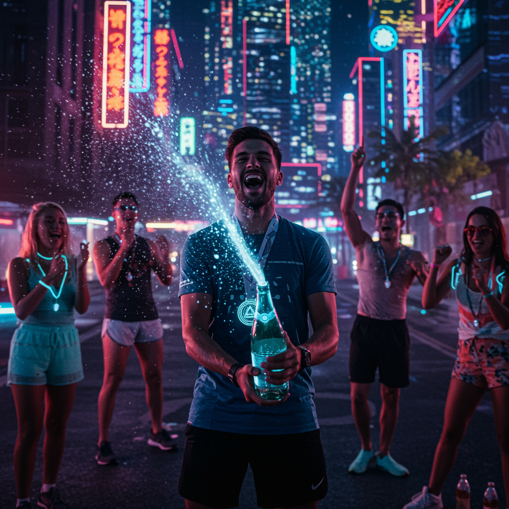 A triumphant athlete stands victorious in the neon-soaked streets of a futuristic city, proudly displaying a holographic medal around their neck. Encircled by friends and teammates dressed in glowing attire, the air thrums with ecstatic energy. In their hands, a bottle of shimmering digital champagne erupts, casting holographic foam that cascades like liquid stardust in all directions, reflecting the vibrant neon lights. Laughter and cheers echo through the cyberpunk night as joy radiates from their faces, the city's towering skyscrapers forming a dazzling backdrop. The scene, captured from a drone's perspective hovering slightly above and in front, encapsulates the essence of a summer celebration in a world where technology and human spirit intertwine seamlessly.