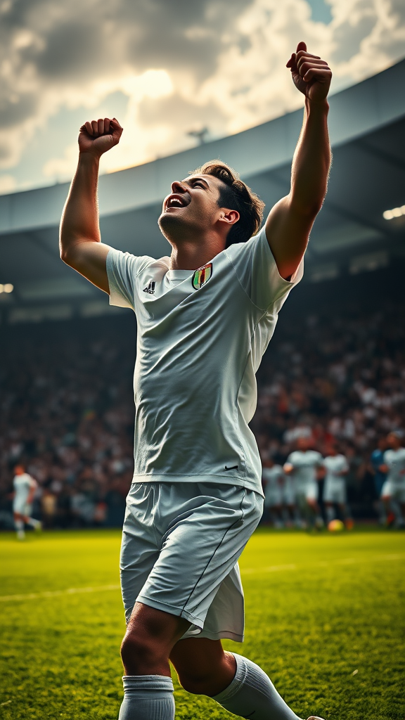A triumphant soccer player in a pristine white jersey, captured mid-celebration as sunlight pierces through dramatic clouds, casting deep, contrasting shadows on his expressive face. His body is slightly twisted, muscles tensed with elation, and arms raised triumphantly towards the heavens. The textured folds of his jersey ripple with the motion, while the lush green of the field beneath him is painted in vibrant hues, offering a stark juxtaposition. In the background, blurred figures of teammates and a roaring crowd create an atmosphere pulsing with energy, reminiscent of Caravaggio's masterful play of light and shadow.
