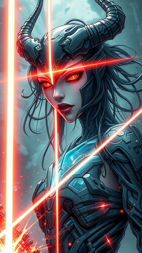 A Tsutomu Nihei-inspired beautiful demon girl with symbiotic features, reminiscent of Venom, set in a futuristic sci-fi world. The scene is hyper-detailed, capturing a laser concentrating in the center, descending from the sky, and interacting with energy clots. The atmosphere is charged with acceleration and light flashes, conveying immense speed. The artwork is a drawing with ultra-detail, showcasing particles merging in a fusion of symmetry. Presented in 8k resolution, the piece boasts comic-style graphics and contour lighting, creating a vivid depth of field. Spotlight effects enhance the scene, viewed from a first-person perspective in HD super-resolution.