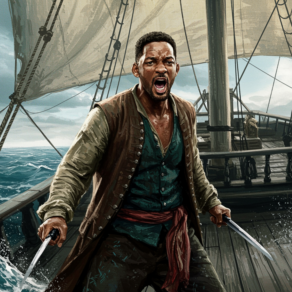 A turbulent scene unfolds aboard a swaying pirate ship on the high seas, where an impassioned Will Smith, his hands slicing through the salty air, is cast in dramatic Fauvism hues. His face, a palette of intense emotions, is painted in shades of porpoise and flint, stark against the fossil-tinted sails billowing behind. The ship's wooden planks and billowing sails, rendered in charcoal and white, contrast the wild sea beneath, evoking a sense of raw expressionism. Crests of waves, hinted at by the brush's vigorous strokes, reflect the inner turmoil of the actor amidst the chaos of the ocean voyage.