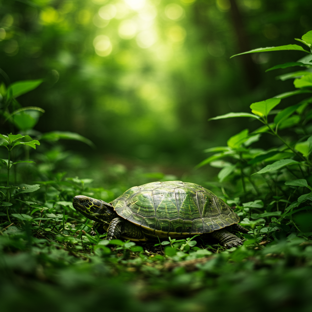 A turtle slowly wanders through a lush, emerald forest, its shell glistening in the dappled sunlight as nature's serenity embraces it.