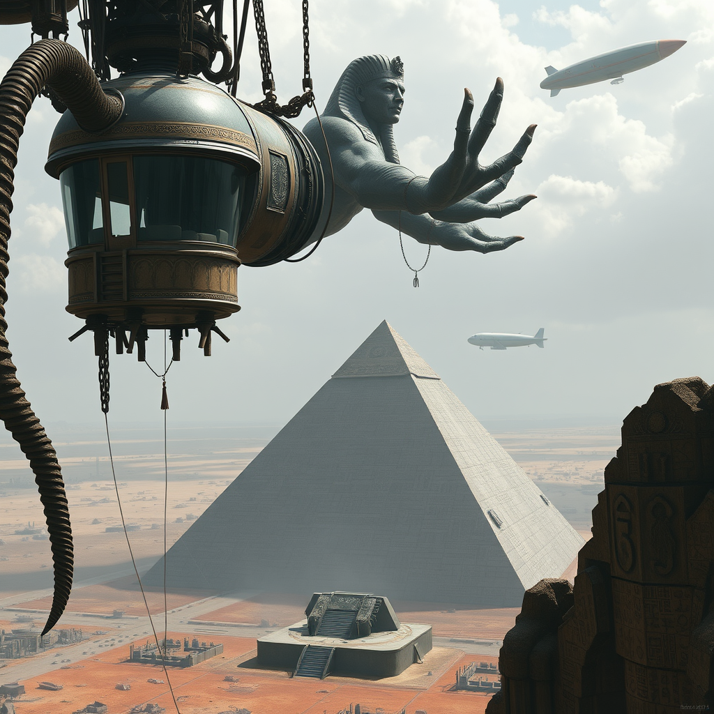 A twisted, ominous, and surreal capsule house hangs suspended in mid-air, supported by massive, twisted steel struts that resemble giant skeletal fingers, its front door a massive, ornate portal that appears to be sucking in the surrounding environment. Large, jagged glass windows offer a fragmented view of the ground far below, where a lone, Egyptian-style pyramid stands atop a plinth, its peak shrouded in a dense, impenetrable shadow. Above the pyramid, a massive, disfigured statue of an Egyptian god seems to reach for the capsule house, its poorly drawn, extra-armed hands grasping for the safety of the dwelling. The air is thick with tiling, mosaiced patterns of mystic symbols, and strange, Egyptian hieroglyphs are scrawled across the walls of the pyramid and the statue in a language that seems to shift and writhe like a living thing. In the distance, a blimp or great airship drifts across the sky, its shadow stretching across the ground like a dark, grasping wing. Below it, two massive balloons, their skins a deep, electric blue, seem to be riding the thermal currents, their strings trailing off into the distance like silken cobwebs. The entire scene is bathed in a hazy, greasy light, as if the very air itself is a dense, dream-pop fog, and everything is suffused with a sense of disorientation, dislocation, and monstrous, all-absorbing fear.