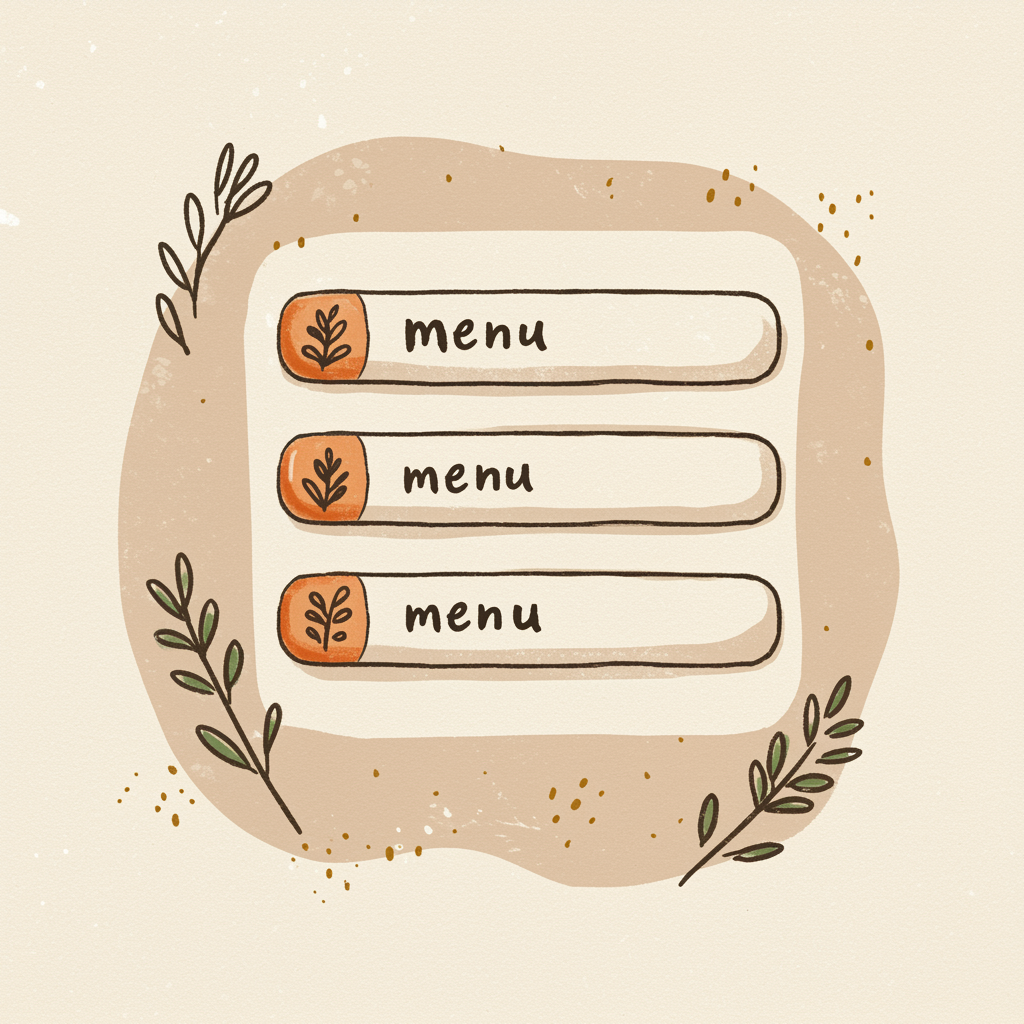 A UI/UX icon of a menu button in a hand-drawn style, featuring an earthy palette inspired by Marc Chagall's art, incorporating natural elements into the design, set against a soft beige background with subtle creative twists.