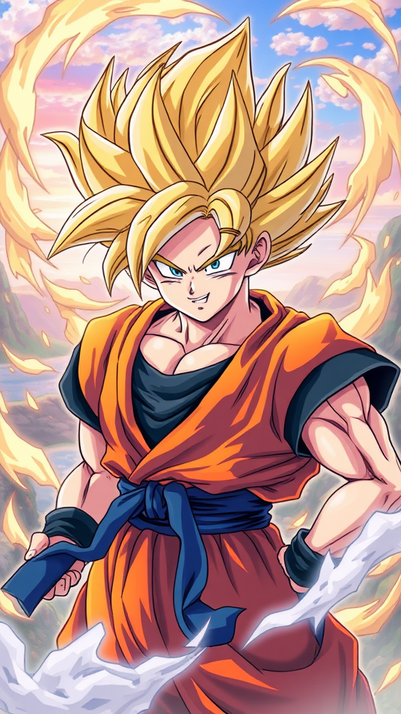 A ultra-high-definition illustration of Goku, depicted in the iconic style of Akira Toriyama, capturing the essence of Dragon Ball with vibrant colors and dynamic energy. The image showcases Goku in a powerful stance, surrounded by swirling auras of energy, his signature spiky hair highlighted with precisionist detail. The background features a hint of otherworldly landscapes, reminiscent of the series' adventurous spirit, while the intricate detailing on Goku's clothing and facial expressions brings out his determined and playful personality. Overall, the artwork blends the familiar elements of the Dragon Ball theme with a fresh approach, maintaining the core spirit while introducing subtle creative enhancements.