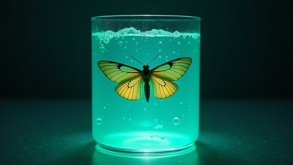 A ultra-realistic cybernetic moth floating gracefully in a glass container filled with a glowing turquoise liquid. Tiny bubbles rise slowly in the turquoise liquid. The glass container is cylindrical, with condensation forming on the outside. The background is dark and muted. The illuminated moth is the focal point of the image with a subtle reflection of the moth visible on the glass surface. Photorealistic style, ultra-high detail, 8K resolution, sharp focus.