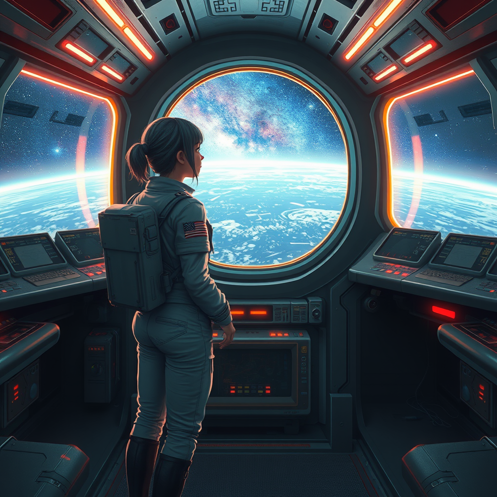A uniformed astronaut girl stands poised within the spaceship command room, gazing out at the breathtaking expanse of the galaxy. The scene is captured in a wide-angle shot, revealing the vastness of space through the observation window. Sci-fi neon lights cast a mesmerizing glow throughout the room, creating an ethereal and futuristic atmosphere. The artwork is a captivating blend of fantasy elements, characterized by intricate details and elegant lines. The digital painting showcases the smooth and sharp focus typical of concept art found on ArtStation, drawing inspiration from the artistic styles of Tian Zi, WLOP, and Alphonse Mucha. This imaginative piece captures the beauty of exploration and the wonder of the cosmos, all depicted with elegance and precision.