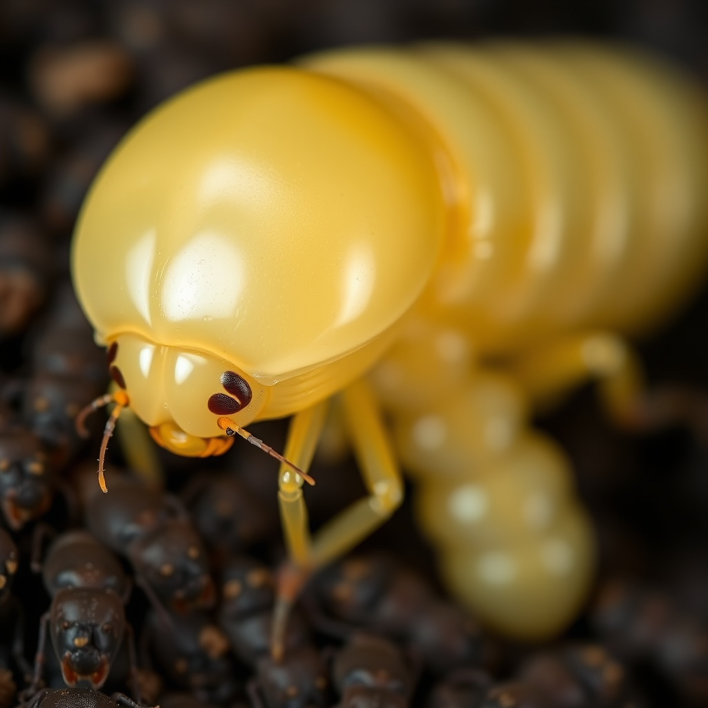 A unique species of parasitic fly larva expertly mimics the appearance of a termite to infiltrate termite colonies. The semi-translucent, pale yellow larva boasts a shiny, bulbous head that closely resembles a termite's with tiny, dark spots for eyes and slender, thread-like antennae. Its segmented body moves across the dark, textured earth, blending effortlessly into the bustling termite community. This close-up shot reveals the larva's minute legs and cunningly designed head structure intended to deceive its unsuspecting hosts. Captured in stunning macro-photography style, the image showcases the larva's remarkable mimicry, with a shallow depth of field highlighting its stealthy integration into its natural subterranean habitat.