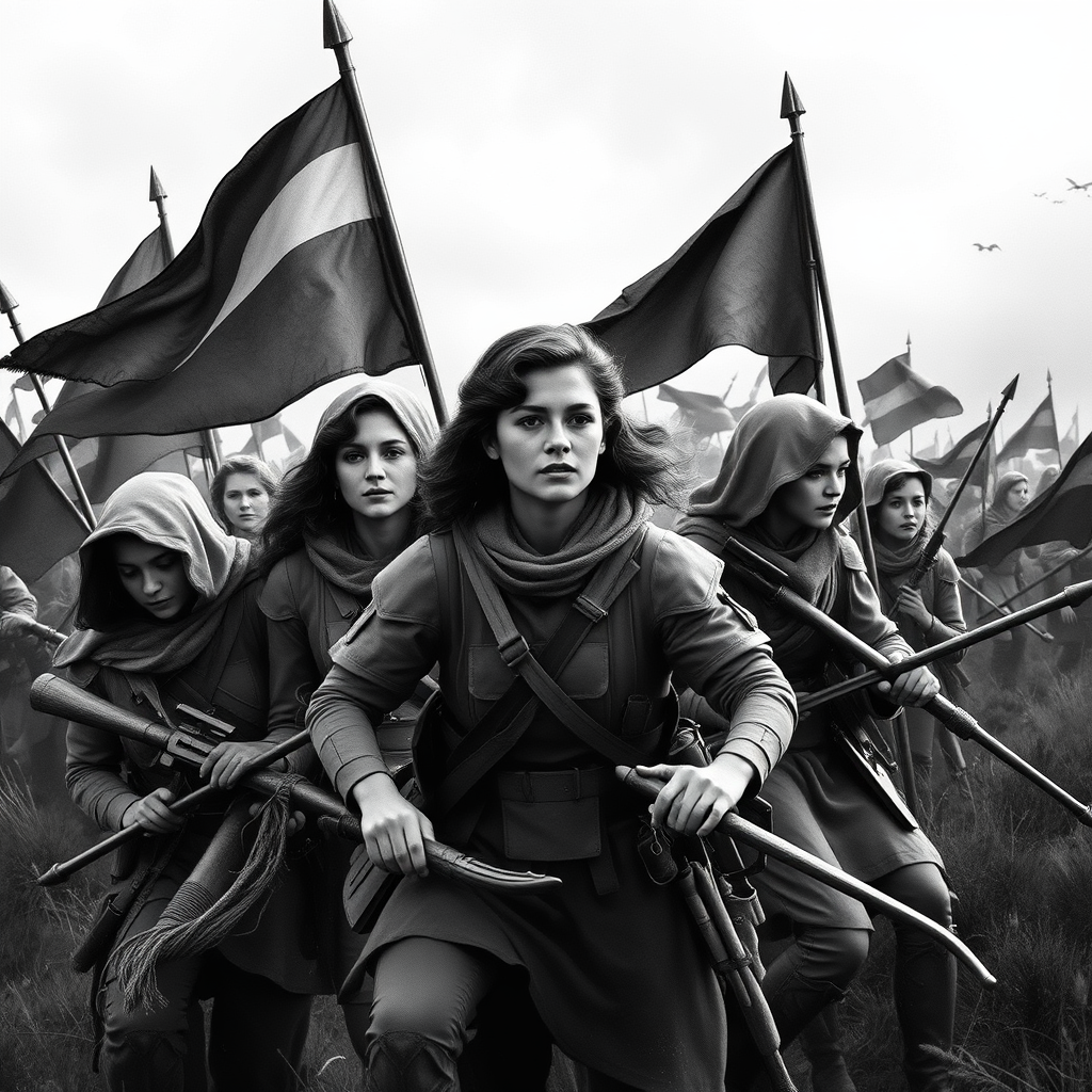 A valiant brigade of sisters waging battles in a grayscale world, united by honor and courage, their strength echoing across the monochrome landscape as they navigate through history’s defining moments.