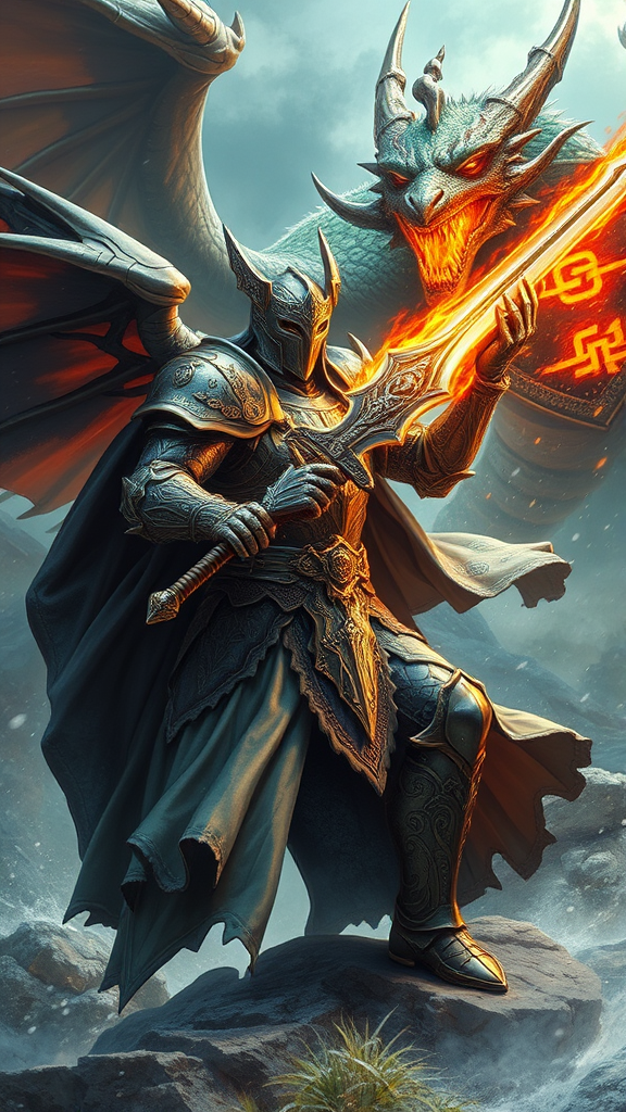 A valiant Dungeons and Dragons paladin clad in intricate, gleaming armor with ornate detailing, brandishing a radiant longsword infused with celestial symbols, engaging in a dynamic action scene amidst a mystical landscape. The paladin's armor reflects an ethereal glow as they confront a fearsome draconic creature, poised with shield raised to block fiery breath. Their cape billows dramatically in the winds of combat, surrounded by an atmosphere of swirling magical energies. This scene is painted in the vivid and immersive style of fantasy art, capturing the heroic essence and epic scale of the confrontation.