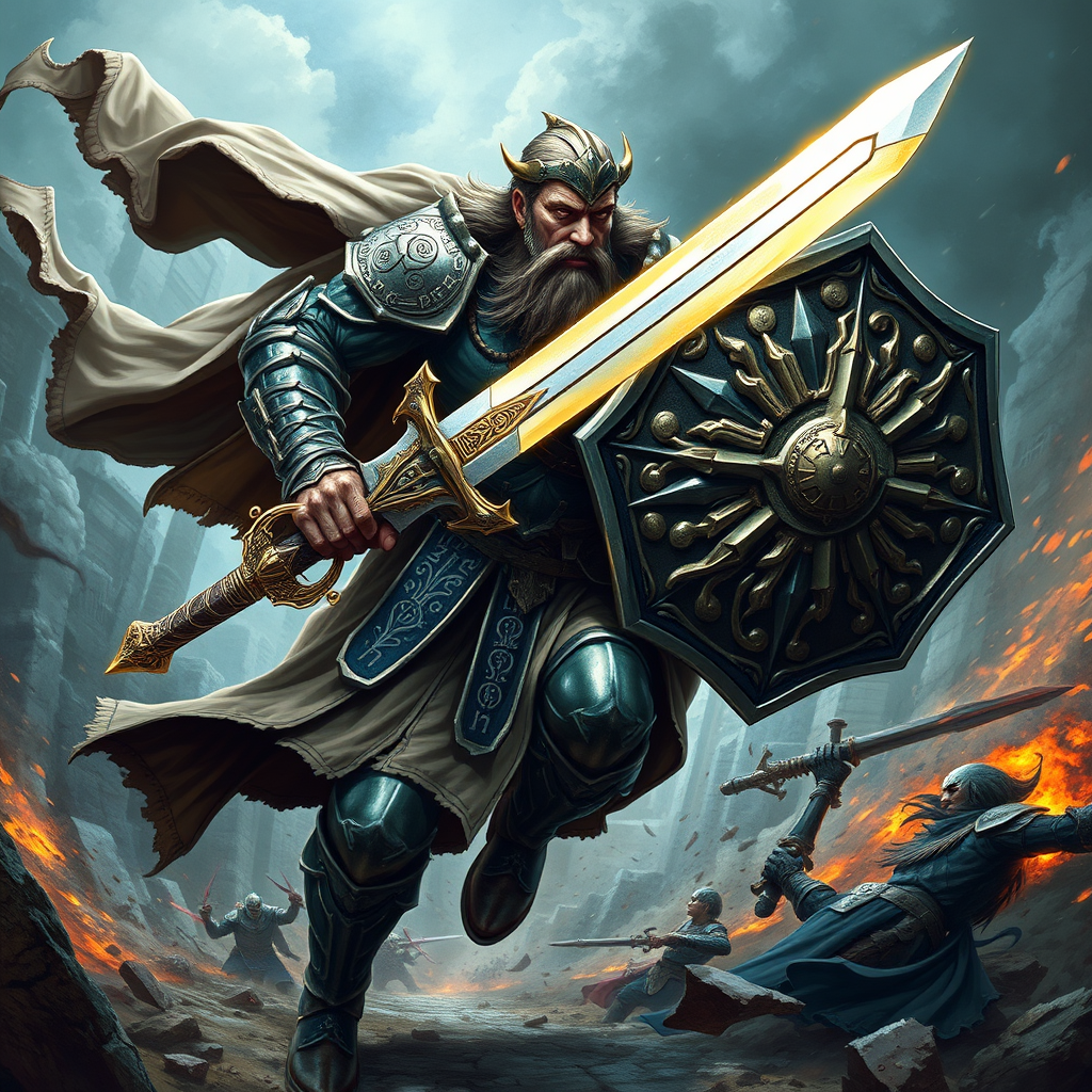 A valiant Dungeons and Dragons paladin, clad in intricately detailed armor that gleams with divine light, charges forward in a dynamic action scene. His magnificent longsword, etched with celestial runes, slices through the air with righteous fury. A large, ornate shield emblazoned with the emblem of his sacred order deflects incoming attacks effortlessly. The background reveals a chaotic battlefield, where creatures of darkness clash against a backdrop of swirling, mystical energies. His determined expression and powerful stance convey unwavering resolve. The scene captures the essence of fantasy art, with vibrant colors and dramatic shadows that emphasize the intensity and movement, all set within a striking vertical composition.