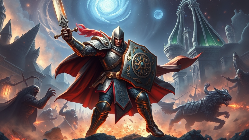 A valiant Dungeons and Dragons paladin stands boldly in intricately detailed armor, gleaming with divine light, as they wield a mighty sword and unyielding shield. The scene captures a dynamic action pose, with the paladin charging into battle against a horde of dark creatures, their cape flowing like a river of steel. The setting is a mystical battlefield, with ancient ruins and flickering enchantments casting an ethereal glow. The artwork embodies the essence of epic fantasy, with vibrant colors and dramatic contrasts highlighting the paladin's unwavering resolve and noble purpose, set amidst a swirling celestial sky.