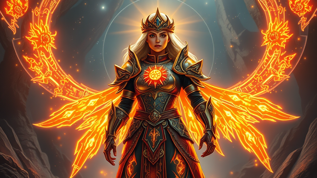 A valiant female paladin adorned in luminous armor, surrounded by celestial radiance, standing confidently amidst a fantasy realm, intricate designs etched in every piece of her attire, casting a glow akin to a supernova; depicting a powerful full-body stance within a richly detailed world, enveloped by ethereal volumetric lighting, showcasing an enchanting contrast against the fantastical backdrop.