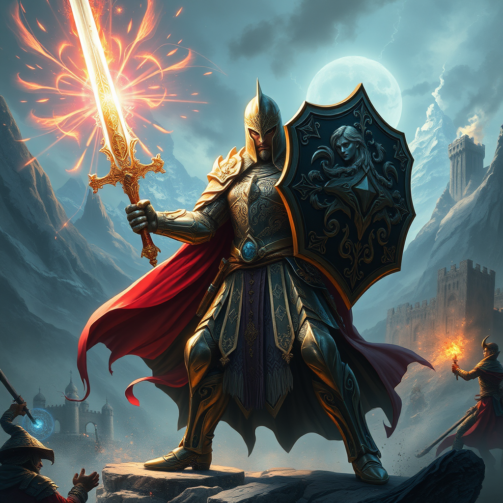 A valiant paladin clad in intricately detailed, gleaming armor, adorned with celestial motifs, wields an ornate longsword shimmering with a holy aura. He stands poised in a dynamic action pose amidst a mythical battleground. The scene captures the intensity of battle, with vibrant magic energies swirling around him, his shield raised, deflecting dark forces. Ethereal light beams down from the heavens, illuminating the paladin with an almost divine radiance, casting dramatic shadows. The background reveals a fantasy landscape with towering mountains and an ancient fortress, emphasizing the epic scale of the conflict. The overall atmosphere is charged with heroism and mystical power, rendered in the classic style of fantasy art.