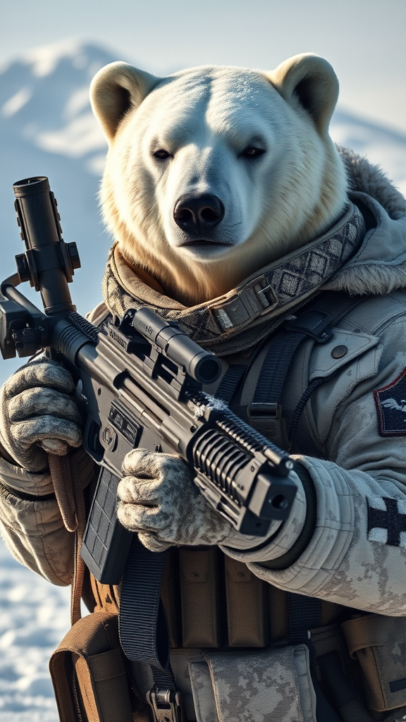 A valiant polar bear clad in an intricately detailed winter military uniform, brandishing a modern tactical rifle, anthropomorphic, featuring hyper-realistic textures, ultra hd, 8k resolution, with exceptional facial detail, dynamic cinematic lighting, set in a 9:16 aspect ratio, showcasing a commanding presence against a majestic Arctic backdrop.